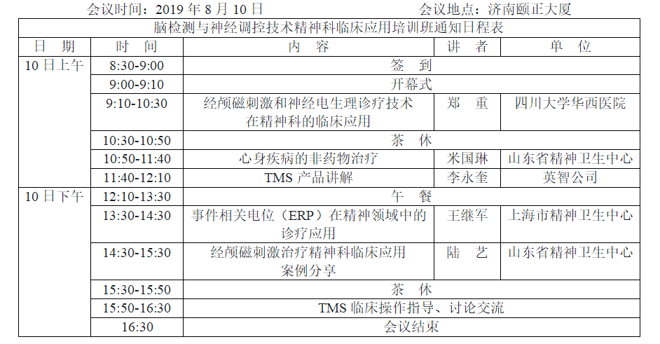 精神疾病是各種生物、心理、社會(huì)環(huán)境因素影響下,出現(xiàn)的大腦功能失調(diào),導(dǎo)致認(rèn)知、情感、意志、行為等不同程度的功能障礙。隨著神經(jīng)調(diào)控技術(shù)的發(fā)展,重復(fù)經(jīng)顱磁刺激(rTMS)、事件相關(guān)電位(ERP)治療技術(shù)在精神科、神經(jīng)科、康復(fù)科等領(lǐng)域的應(yīng)用越來(lái)越廣泛。為進(jìn)一步推廣、規(guī)范開(kāi)展經(jīng)顱磁刺激治療與事件相關(guān)電位技術(shù)臨床應(yīng)用,建立省內(nèi)各級(jí)精神衛(wèi)生醫(yī)療機(jī)構(gòu)操作規(guī)范和臨床溝通協(xié)作的交流指導(dǎo)平臺(tái),山東省精神衛(wèi)生專科聯(lián)盟物理治療協(xié)作組將在濟(jì)南舉辦“腦檢測(cè)與神經(jīng)調(diào)控技術(shù)精神科臨床應(yīng)用培訓(xùn)班通知”,邀請(qǐng)國(guó)內(nèi)知名精神衛(wèi)生、心身疾病、物理診療等領(lǐng)域的專家進(jìn)行授課。現(xiàn)將會(huì)議有關(guān)事宜通知如下: