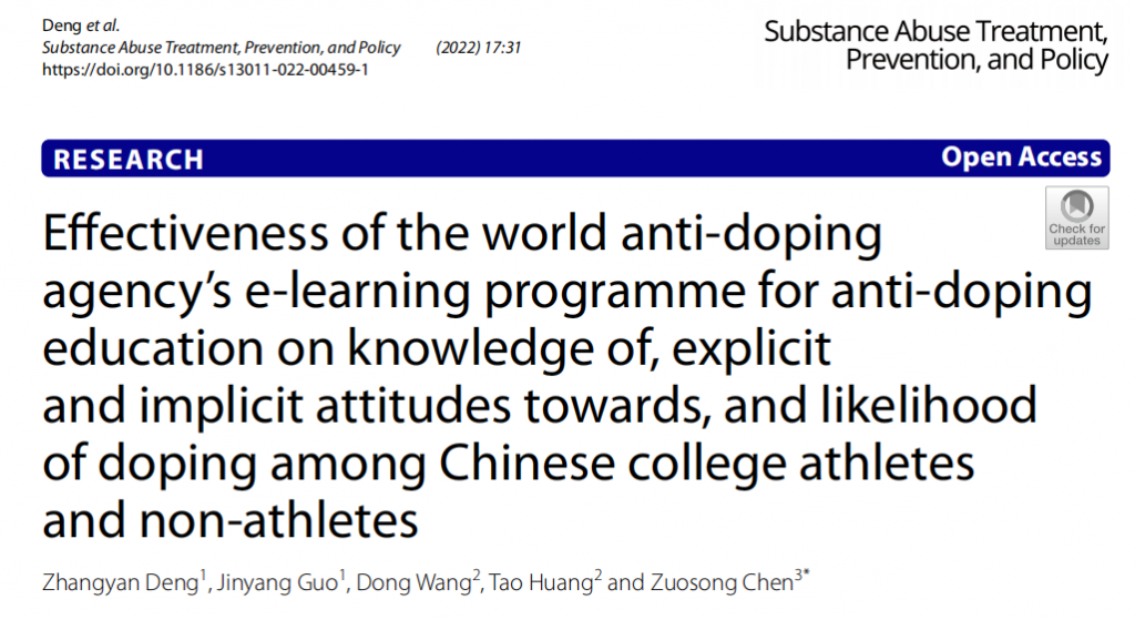 參考文獻:Deng Z, Guo J, Wang D, Huang T, Chen Z. Effectiveness of the world anti-doping agency's e-learning programme for anti-doping education on knowledge of, explicit and implicit attitudes towards, and likelihood of doping among Chinese college athletes and non-athletes. Subst Abuse Treat Prev Policy. 2022;17(1):31. Published 2022 Apr 26. doi:10.1186/s13011-022-00459-1 IF=2.583