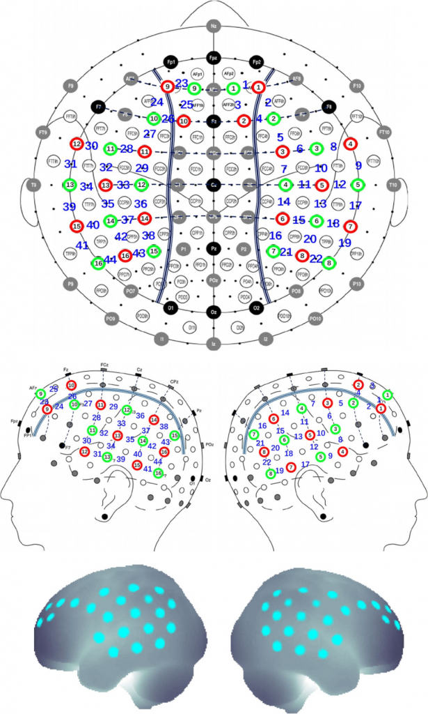 fNIRS檢測:進行BIAT任務檢測期間使用NIRSport2 16*16(深圳市瀚翔生物醫療電子股份有限公司)進行腦功能檢測,使用雙光源探測器,采樣率為4.45Hz,探頭布局依據10-10腦電系統,覆蓋額、頂、顳葉共44通道,光源探測器距離為3cm。采集任務期間5-45s 含氧血紅蛋白(HbO)均值進行數據分析。