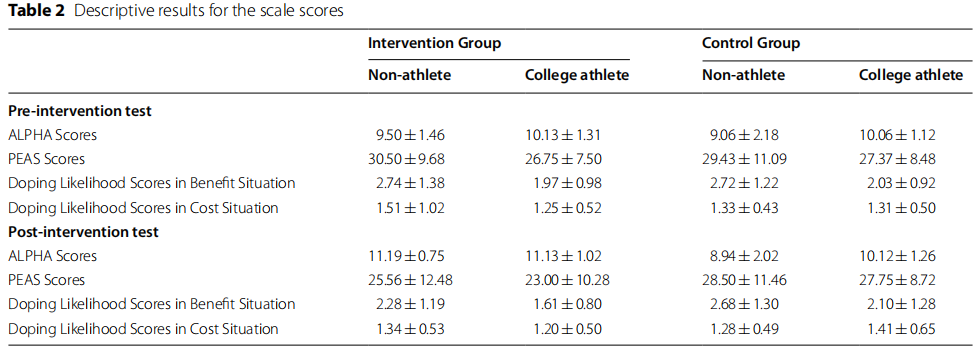 量表評估:AIPHA;績效提升態度量表(The Chinese version of the Performance Enhancement Attitude Scale,PEAS);興奮劑使用可能性量表(The doping likelihood scale);簡要內隱聯想測試(brief implicit association test,BIAT)
