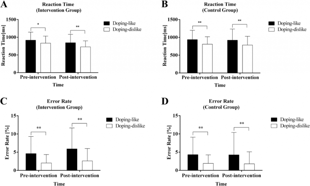 在BIAT任務中,使用興奮劑條件中評估的反應時和錯誤率高于不使用興奮劑條件(p<0.01,p<0.01)