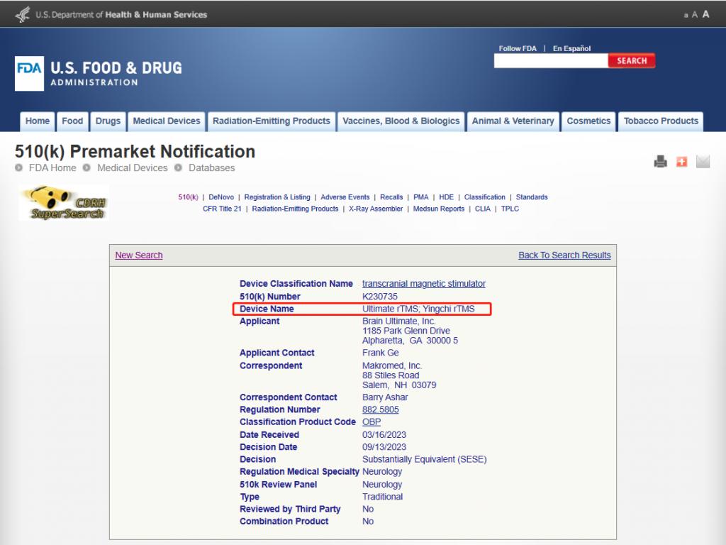 2023年9月,深圳英智科技有限公司自主研發的M系列經顱磁刺激儀(transcranial magnetic stimulation, TMS)正式獲得FDA批準,用于重度抑郁障礙(Major Depressive Disorder, MDD)的治療(K230735)。這意味著“英智TMS”成為首家獲得美國FDA批準的國產經顱磁刺激儀品牌! 這也是FDA首次批準中國精神疾病類無創治療設備進入美國市場!