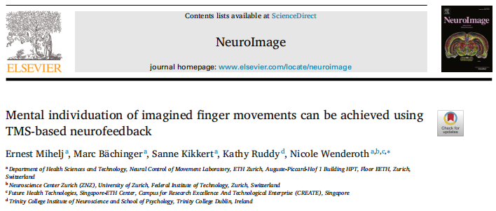 本研究Mental individuation of imagined finger movements can be achieved using TMS-based neurofeedback 發(fā)表于2021年的NeuroImage(IF:5.7),來自蘇黎世聯(lián)邦理工學(xué)院的Ernest Mihelj為第一作者。