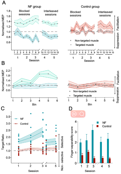 首先比較在訓(xùn)練過程中,NF組和對照組的MEP波幅的變化(圖2A)。結(jié)果發(fā)現(xiàn),兩組在調(diào)節(jié)靶肌和非靶肌MEP波幅方面存在差異:NF組成功地調(diào)節(jié)了MI,使靶肌的MEP激活,非靶肌的MEP抑制。在對照組中,靶肌MEP有大于非靶肌MEP的趨勢,但這種差異比NF組小得多,并且在訓(xùn)練過程中變化較小。