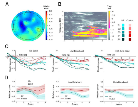 在頂枕電極簇,高β頻段ERD隨著訓(xùn)練逐漸增加,但僅在NF組中增加,而對照組幾乎沒有增加。這些結(jié)果表明,TMS-NF可能影響了與感覺運(yùn)動(dòng)處理相關(guān)的高級區(qū)域的活動(dòng)。
