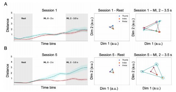 對于MEP的分析,使用的是標(biāo)準(zhǔn)化的波峰到波峰的MEP振幅和標(biāo)準(zhǔn)化的MEP均方根(從3個(gè)右手肌電電極中提取)。然后,我們使用特征向量來計(jì)算條件之間的交叉驗(yàn)證歐幾里得距離。這一過程產(chǎn)生了一個(gè)表征相異性矩陣(RDM),用于表示每個(gè)session的條件和參與者之間的指間距離。接下來,從RDM中,我們通過平均非對角線元素來估計(jì)“手指區(qū)分度”,通過一個(gè)數(shù)字來捕捉三個(gè)MI條件下MEP特征之間的距離。MI產(chǎn)生的MEP圖形越清晰,手指區(qū)分度評分越高。