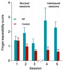 表征相似性分析(RSA)是一種多變量方法,可用于推斷不同MI任務(wù)是否由特定的神經(jīng)活動(dòng)模式表示。分析結(jié)果發(fā)現(xiàn),手指區(qū)分度評分在準(zhǔn)備休息期間比較小,但在開始MI后逐漸增加,表明在拇指、食指和小指進(jìn)行MI時(shí),EEG激活模式差異越來越大(圖5)。與對照組相比,NF組的手指可分離程度顯著增加(圖6;組 x session 交互X2(4,10)=17.55, p = 0.001)。