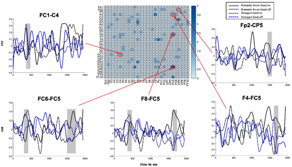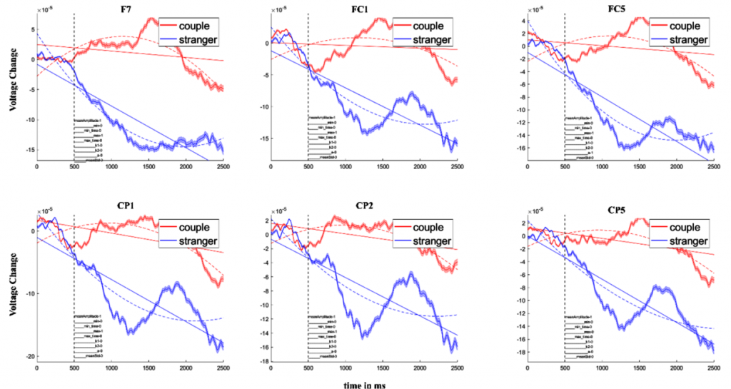 在愛情中,我們常說“心有靈犀一點通”,河南大學陳亞楠課題組最新研究印證了這一點:在親密接觸時,相較于陌生人,情侶之間的腦間同步性會增強。