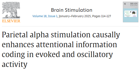 2025年1月,劍橋大學(xué)Runhao Lu 等人在Brain Stimulation期刊(IF:7.6)發(fā)表了題為“Parietal alpha stimulation causally enhances attentional information coding in evoked and oscillatory activity” 的文章。