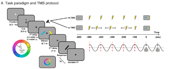 圖1A 實(shí)驗(yàn)設(shè)計(jì):在注視點(diǎn)之后會(huì)出現(xiàn)提示,由兩種符號(hào)組成,一種讓受試者注意左邊或右邊,另一種注意顏色或朝向,接著會(huì)出現(xiàn)彩色的傾斜條,受試者需要在色輪中點(diǎn)擊選擇相應(yīng)的顏色和朝向。在TMS-EEG研究中,在IPS區(qū)域進(jìn)行5次脈沖刺激脈沖分為有節(jié)律的(rh-TMS)和無節(jié)律的(ar-TMS)。