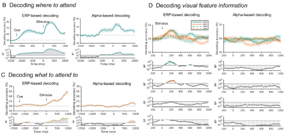 圖1C所示,ERP和α能量也可以很好地編碼注意什么(注意顏色vs.方向)的信息。刺激開始后,基于ERP的解碼準(zhǔn)確率逐漸上升,并持續(xù)增加至結(jié)束;而基于α的解碼在提示呈現(xiàn)結(jié)束以后才開始。