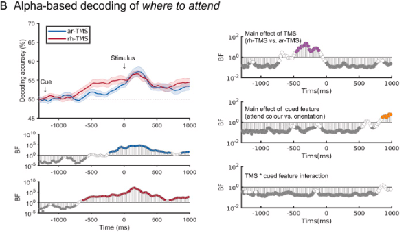 α節(jié)律的rh-TMS相對(duì)于ar-TMS能夠提高對(duì)注意哪里(where)信息的編碼(圖3)。在ERP的解碼中,解碼能力在刺激出現(xiàn)以后快速上升(圖3A),而α功率的解碼在刺激開始前,大約220ms左右達(dá)到峰值(圖3B)。