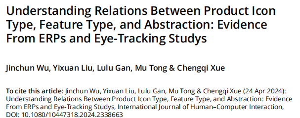東南大學(xué)機械工程學(xué)院的薛澄岐教授團隊于2024年4月在INTERNATIONAL JOURNAL OF HUMAN COMPUTER INTERACTION(5-Years IF =4.5)發(fā)表名為Understanding Relations Between Product Icon Type, Feature Type, and Abstraction: Evidence From ERPs and Eye-Tracking Studys 的研究。