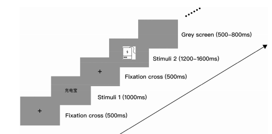 采用S1-S2范式。每次試驗開始時,受試者注視屏幕中央500毫秒。隨后,在屏幕中央呈現(xiàn)一段文本S1(產(chǎn)品中文名稱),持續(xù)1000 ms。然后,出現(xiàn)灰色屏幕,持續(xù)500 ms,然后是一個目標(biāo)S2(包括與S1匹配和不匹配的條件),持續(xù)時間1200-1600 ms(見圖2)。受試者被要求盡快用左手或右手食指按下相應(yīng)的鍵(文本與圖片一致按“Q”,不一致按“P”)。按鍵之后,出現(xiàn)隨機持續(xù)500 - 800ms的灰色屏幕,然后開始新的試驗。本實驗為2(產(chǎn)品類型:實用產(chǎn)品vs.娛樂產(chǎn)品)×3(抽象層次:低、中、高)實驗設(shè)計,共6個條件。