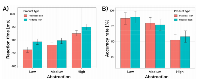 圖3 (A)表示受試者對低、中、高3種抽象層次的娛樂型和實用型產(chǎn)品圖標(biāo)的反應(yīng)時間;(B)分別表示受試者對低、中、高3種抽象層次的娛樂型和實用型產(chǎn)品圖標(biāo)的正確率。
