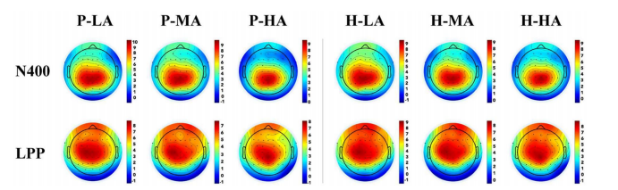 圖4 在380 ~ 480 ms (N400)和600 ~ 800 ms (LPP)的時間窗,6種條件下的腦電地形圖