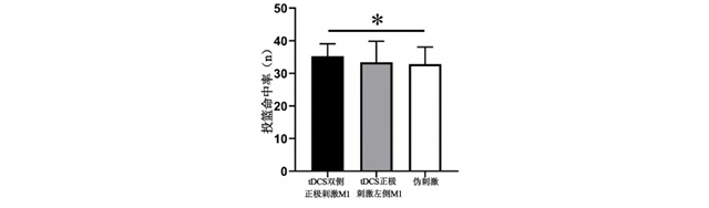 tDCS雙側正極刺激M1組投籃命中率高于偽刺激組(P=0.010),提高9.72%,tDCS正極刺激左側 M1 組和偽刺激組之間無顯著差異(P=0.589)。見圖5。