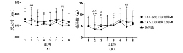 組塊2(P=0.005)、組塊3(P=0.014)和組塊7(P=0.022)的錯誤數在tDCS雙側正極刺激M1組低于偽刺激組,組塊2的錯誤數在tDCS正極刺激左側 M1 組低于偽刺激組(P=0.008),組塊 3(P=0.045)和組塊7(P=0.004)錯誤數在tDCS雙側正極刺激M1組低于tDCS正極刺激左側M1組。見圖6B。