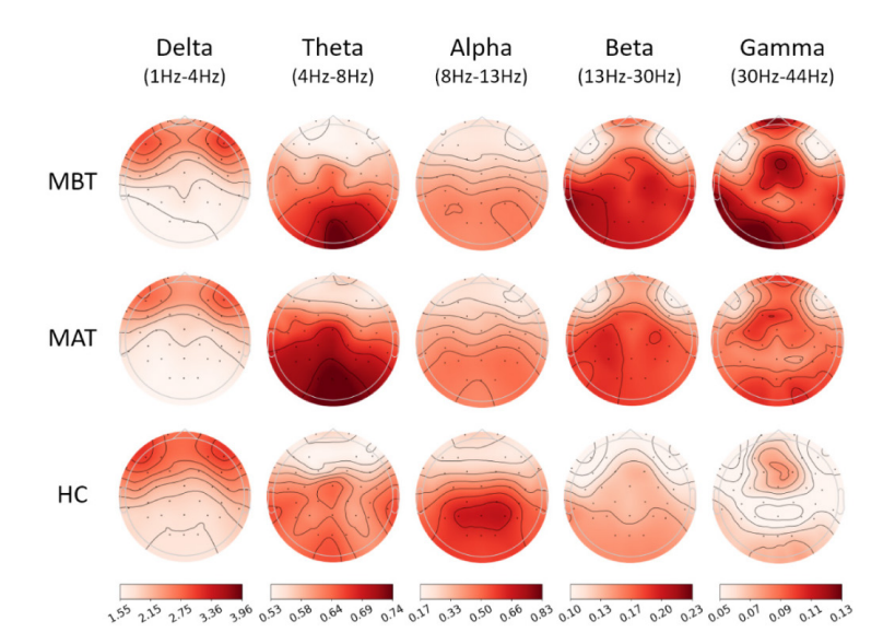 rTMS 干預后,METH 依賴者的 alpha、beta 和 gamma 波 RBP 與健康對照組(HC)更加接近,相比治療前(干預前),表明rTMS能在神經活動水平上部分恢復腦功能。EEG 功率拓撲圖顯示,干預后 在這些頻段的分布更類似健康個體的式。