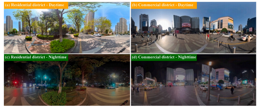 本研究采用2×2混合實驗設計,城區(住宅區與商業區,即RD vs. CD)作為受試者內部變量,光環境(白天vs.夜間)作為受試者間變量。將43名受試者隨機分配到4個場景中的兩個。