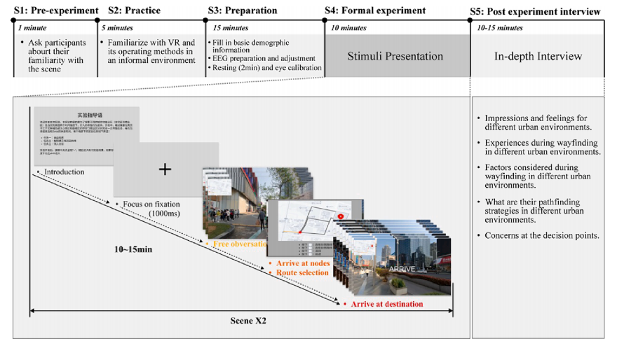 尋路,即利用環境線索找到并到達目的地的過程,對于個體與周圍環境的互動至關重要。城市環境的布局和建筑屬性各不相同,導致人們的體驗、空間感知存在差異,這些差異會影響人們在尋路過程中的表現,從而影響尋路行為和認知狀態。同時,光照條件的變化也會影響感知,影響認知地圖和尋路行為。但是,不同城市環境類型和光照條件對行人尋路認知的影響研究有限。本研究提出了一種將VR(嵌入式全景照片)、眼動追蹤和腦電圖相結合的融合技術來采集同步數據,主要關注尋路過程中的感知行為、注意機制和神經振蕩,旨在增強對尋路的認知過程的理解。