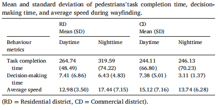 在任務執行方面,本研究發現不同城市環境下受試者的任務完成時間存在顯著差異,住宅區的任務完成時間比商業區的要長。但是,這兩個區域的平均速度沒有顯著差異。