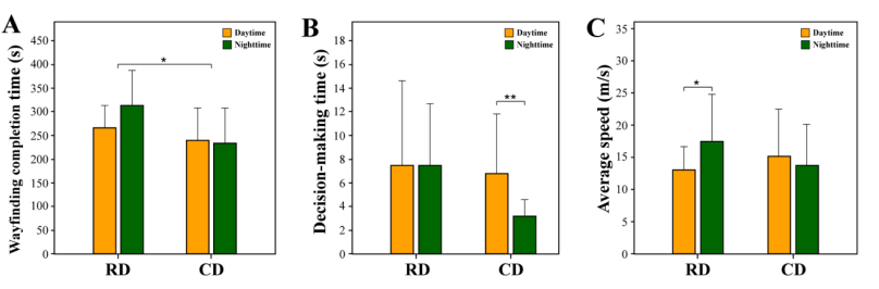 圖5 參與者在住宅區和商業區尋路任務中的表現。A為行人完成尋路任務的平均任務完成時間;B為行人完成尋路任務的平均決策時間;C表示行人完成尋路任務的平均速度