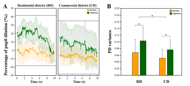 圖6顯示了所有條件下PD(瞳孔擴張)的持續下降,與商業區相比,住宅區的PD明顯更高,表明商業區尋路的認知負荷更高。此外,住宅區和商業區白天的PD均小于夜間。對PD方差進行統計分析(見表7和圖8),發現城區的主效應顯著(p = 0.004),住宅區的PD方差大于商業區。此外,光環境的主效應顯著(p = 0.001),在住宅區和商業區,夜間的PD方差均高于白天。