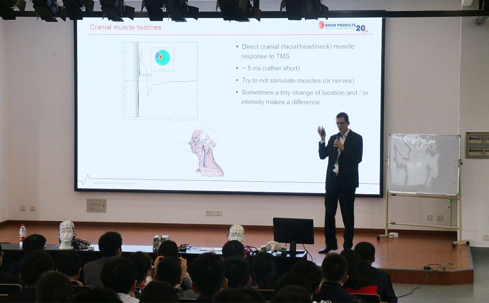 特邀專家分享了基于ERP事件相關電位、TMS設備在社會認知研究、腦卒中、情緒、精神障礙、腦機接口等各個研究方向和領域的研究應用與心得。Brain Products公司還特別設立了與TMS結合采集EEG的互動環節與參會人員零距離溝通,讓每一位參會代表了解了兩種技術結合的問題與新的解決方案。相信各位專家的精彩報告與互動可以幫助每一位學員了解最新的ERP與TMS研究動向,并能以此來指導心理學實驗設計與臨床應用,拓寬心理學與多學科融合研究的道路。