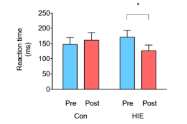 行為結果 在Stroop結果中,實驗對比了HIE(高強度訓練組)和控制組之間的stroop效應對比(不一致和中性條件下),發現只有高強度間歇性訓練的組別有明顯的stroop成績的提高,說明了進行HIE高強度間歇性訓練能夠帶來認知提高。
