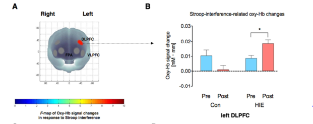 高強度間歇運動提高了其Stroop測量中的表現,即縮短了干擾詞的反應時間。同時發現在前后近紅外腦功能成像系統測量中左背外側前額葉有明顯相關激活。