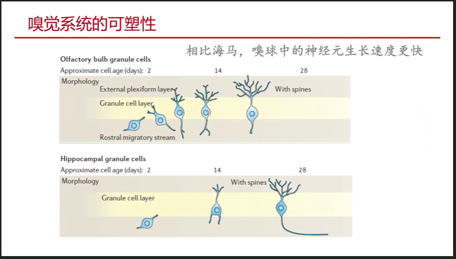 圖中就是成年人大腦中嗅球和海馬新生神經元的一個生長情況。我們可以看到嗅球中的神經元生長速度會更快。所以繡球乃至整個嗅覺系統的重塑,只有在特定的一些條件下才會發生。我們知道運動對于我們每個人來說,都是可以促進我們的健康。所以。運動其實就是這樣一種非常適合的刺激條件。