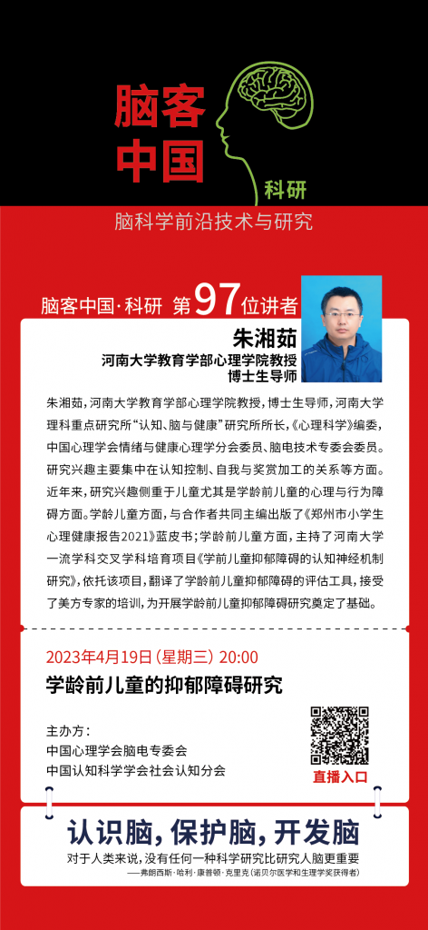 【直播預告】 本周三晚20點 朱湘茹:學齡前兒童的抑郁障礙研究