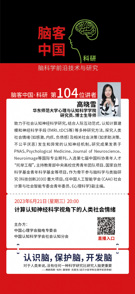 【直播預告】 6月21日晚20點 高曉雪:計算認知神經科學視角下的人類社會情緒