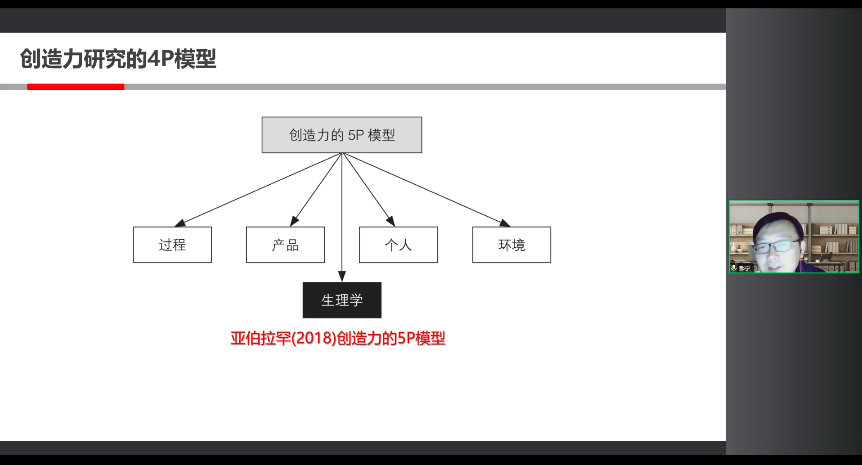 除了4C理論,創造的研究當中還有一個4P模型,我們要了解creativity可以從4個角度去理解它。 比如說創造性的人,他具有什么人格特征,行為特征;創造性的產品有什么樣的特征,我們怎么評價它;創造性的過程主要講的是創造性的認知過程,主要涉及到我們的認知操作;最后一個就是創造性的環境,什么樣的環境讓人更有創造性。4P模型是1961年由羅茲提出來的,亞伯拉罕在2018年又新加了一個生理學的角度,打造了5P模型。