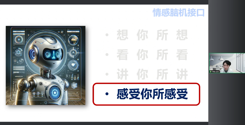 情感腦機接口更具體的目的就是實現感受你所感受。想象一下在未來十年或二十年的生活中,當我們回到家里面,家庭的所有聲光電都可以通過我們的情感來控制。比如說工作了一天非常的疲憊,回到家里后檢測到我的情緒有一點點消沉,然后電視就會自動播放一些比較愉快輕松的音樂,燈光也會自動調的比較溫和。通過這樣子的方式來給我們創造一個更加舒適,更加宜人的生活環境。