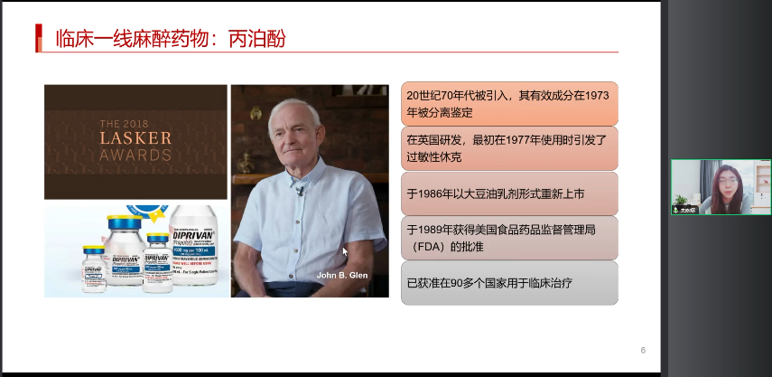2018年美國拉斯克獎將臨床醫(yī)學獎頒給了丙泊酚的研發(fā)者約翰格倫,足以證明丙泊酚的重要性。丙泊酚的活性成分其實在1973年就被分離出來了,中間經歷了很長時間的一個溶劑的改良,最終在1989年獲得FDA的一個批準。