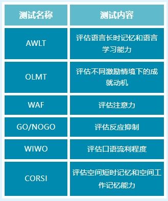 采用蒙特利爾認知評估(MoCA)分別在干預前(即在干預前6周內),以及認知干預結束后的6和12個月內對健康老年人進行認知評估。同時,采用VTS維也納心理測試系統(奧地利Schuhfried公司生產,國內由深圳瀚翔腦科學技術股份有限公司總代理)進行認知測試(詳見表1),并將測試分數進行主成分分析,計算出認知綜合分數。