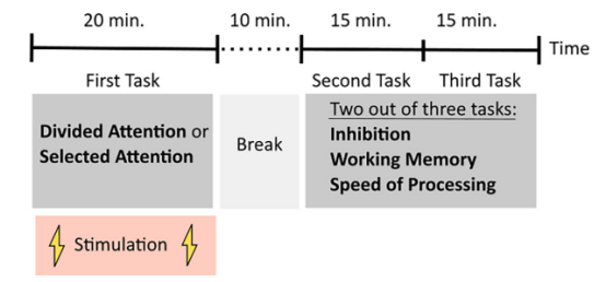 本研究采用雙盲設計,被試被隨機分配進行tDCS、tACS、偽刺激中的一種,在每個干預過程的前20分鐘進行經顱電刺激,在這一過程中,被試交替訓練選擇性注意和分配性注意,每個注意域訓練5次。