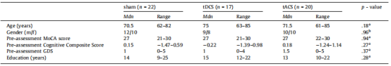 刺激組在年齡、性別、受教育程度、一般認知表現(MoCA)、GDS評分和認知綜合評分方面沒有顯著差異(表2)。