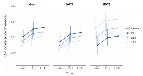 兩組被試的認知綜合評分均有顯著提高,但未受到神經刺激的進一步調節。其他分析顯示,初始蒙特利爾認知評估(MoCA)評分較低(<1 SD)的參與者在tDCS中的改善明顯高于偽刺激組。