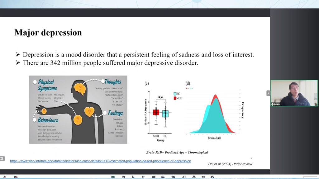 目前來(lái)說(shuō),它已經(jīng)影響了全球3.42億人。它有不同的癥狀表現(xiàn),包括軀體上的,行為上的,思維上的以及身體感受。我們自己和前人研究發(fā)現(xiàn)抑郁癥個(gè)體,他們大腦年齡其實(shí)相比正常人都是更老的。