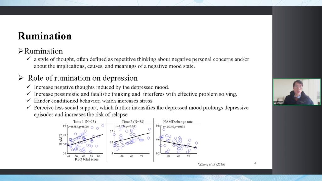 從時(shí)間的角度進(jìn)行分析,當(dāng)更注重的是對(duì)過(guò)去的過(guò)度思考,我們叫反芻思維;指向當(dāng)下的,就是感覺(jué)生活沒(méi)有意義,出現(xiàn)快感缺失;以及指向未來(lái)的興趣減退。 在這個(gè)框架下想進(jìn)一步去結(jié)合我自己感興趣的認(rèn)知控制方面來(lái)去做,采用的技術(shù)就是主持人在前面提到的腦成像和計(jì)算建模來(lái)充分解構(gòu)我們這樣的抑郁癥狀。