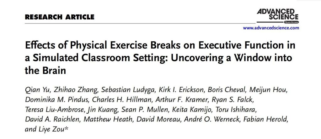 近期,深圳大學鄒立業(yè)教授(通訊作者)及其團隊在Advanced Science期刊(IF= 14.3)發(fā)表了題為“Effects of Physical Exercise Breaks on Executive Function in a Simulated Classroom Setting: Uncovering a Window into the Brain” 的文章,研究發(fā)現(xiàn),在久坐期間進行短暫運動干預能夠改善執(zhí)行功能,對提高認知表現(xiàn)有積極影響。