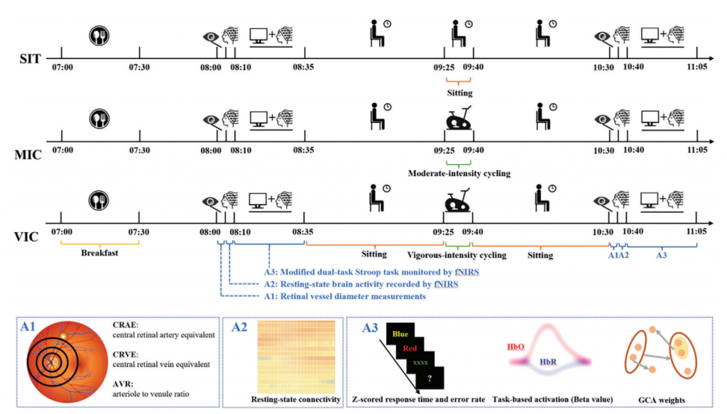 在此背景下,本研究通過雙Stroop任務測量、fNIRS皮層血流動力學和視網(wǎng)膜微血管狀態(tài)測量,研究久坐期間體育鍛煉干預對執(zhí)行功能的影響。為了模擬現(xiàn)實世界的場景,兩段久坐和運動休息的時間被設定為與國內(nèi)大學的連續(xù)兩節(jié)課和休息時長一致。