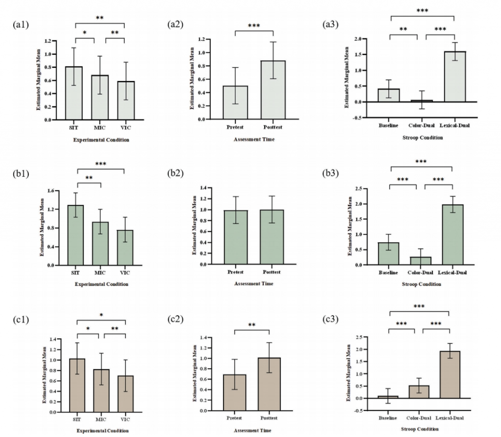 實驗組別與評估時間之間的顯著交互作用、實驗組別與Stroop條件之間的顯著交互作用,以及評估時間與Stroop條件之間的顯著交互作用。與SIT組相比,MIC組和VIC組從干預前到干預后的任務因果密度均有所增強。干預前后,VIC組比MIC組因果密度顯著提高。