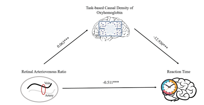 研究建立了一個標準中介模型,旨在探討AVR對反應時間(RT)的影響是否通過基于任務的氧合血紅蛋白(oxyhemoglobin, HbO)因果密度起作用(見圖5)。結果顯示,在控制了任務相關的HbO因果密度的影響后,AVR對RT的直接效應仍然顯著。通過計算間接效應,任務相關的HbO因果密度在AVR與RT之間起到了中介作用,中介效應顯著。