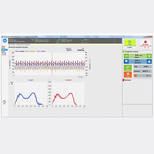 h/p cosmos gaitway II 將壓電晶體測力臺裝入跑臺中,使跑臺能連續測量跑步和行走中的地面垂直反作用力、壓力中心、雙腳足底沖擊等參數。Gaitway II 內置的瑞士Kistler測力板,Kistler測力板廣泛應用于醫學、體育學的步態研究中,在測量地面支撐反作用力方面已經成為世界標準。將測力板裝在跑臺上進行步態分析有很多優點,傳統方法是將測力臺固定在地面上,只能進行1~2步的步態分析,然而我們將測力臺裝在跑臺上以后,就能進行連續的步態分析,更接近于日常生活和訓練時的狀態。